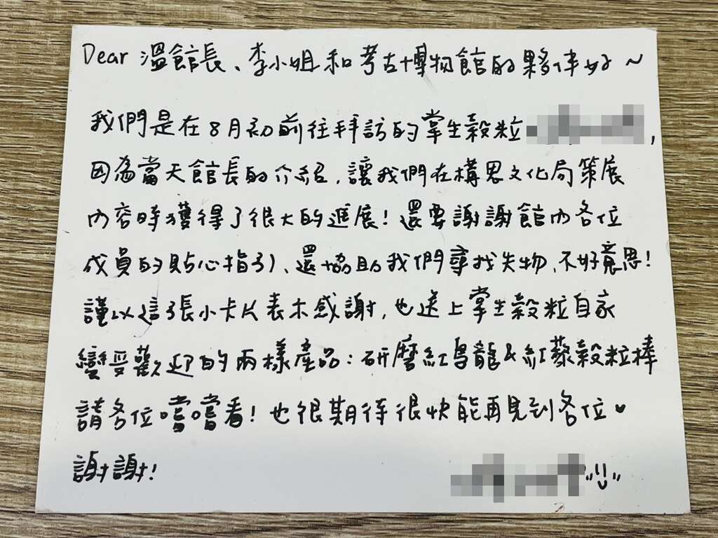 印象中有件很深刻的事,掌生穀粒糧商號股份有限公司曾來參訪考古館,離開時有人遺漏了雨傘,我們協助將傘寄回,後來他們有寄明信片和感謝小禮到考古館。這幾年館舍的硬體設備改善蠻多,包括空氣品質監測、防水工程、全熱交換及除濕系統、電力增設等,以前有的問題皆一一改善。