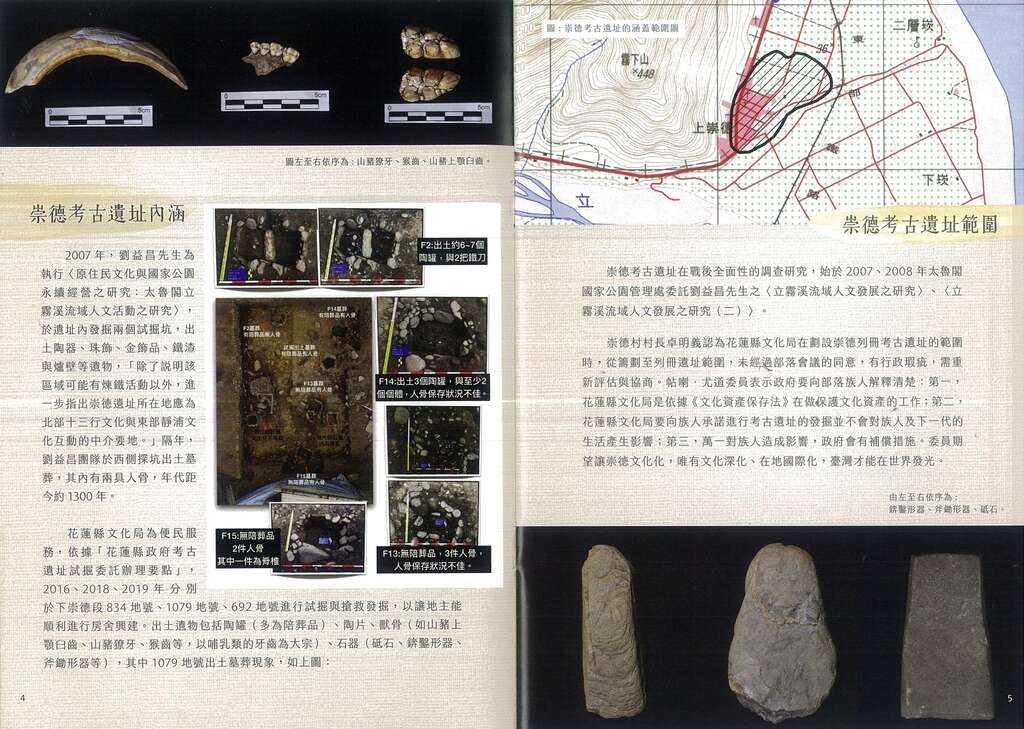 從最早用於祭儀的雞蛋到資本主義出現的硬幣,物質的使用隨著年代的變遷有了不同的意涵。2020年花蓮縣文化局於太魯閣文創園區推出「『看見』連結時空的壹圓硬幣—崇德考古遺址特展」,從地表上的壹圓硬幣切入,連結在地太魯閣族文化,同時也深入地底的考古發掘,用不同的主體呈現考古與原住民之古今連結。1923年日本學者移川子之藏與宮本延人發現崇德遺址,其範圍與現今聚落幾乎完全重疊,一直從立霧溪出海口至上崇德聚落的周圍,該遺址屬於十三行文化普洛灣類型。在同一塊土地上,千年之中不同的年代有不同的人居住、生活著,時光流轉,說不定你/妳的腳下也有臺灣演變的秘密藏於其中呢!