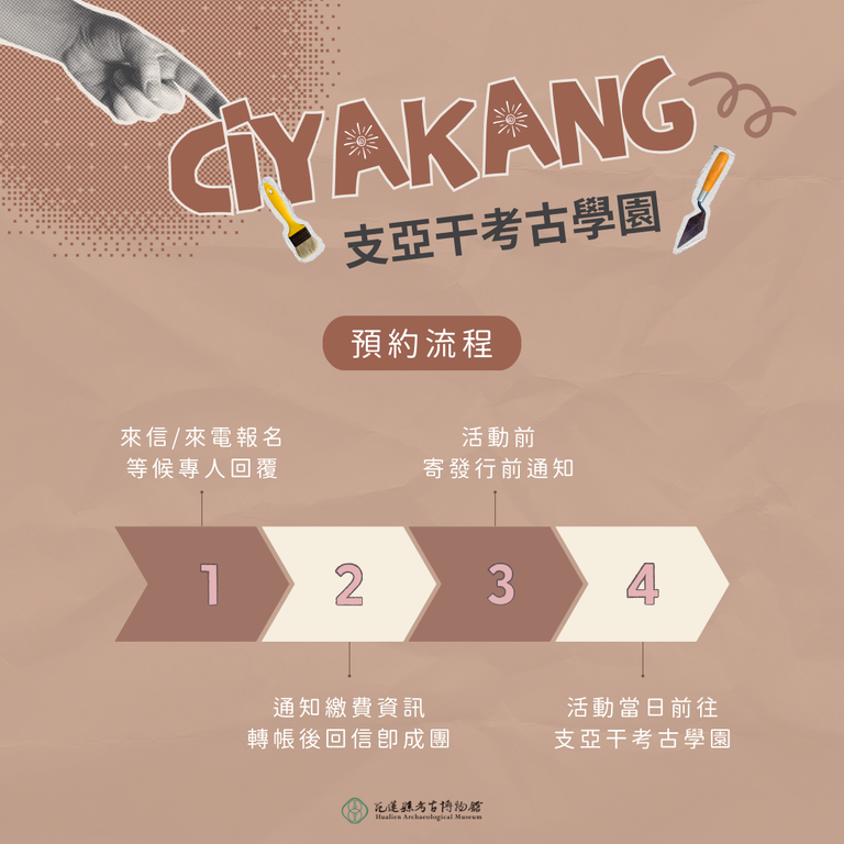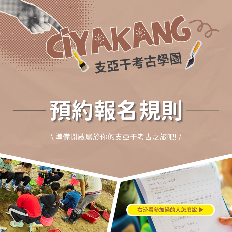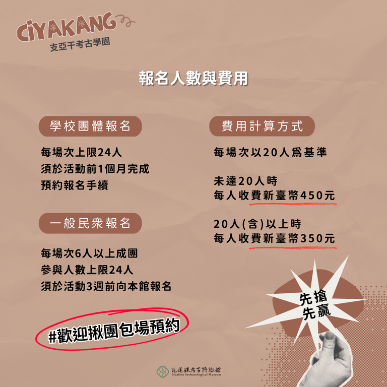 (二)一般民眾報名:每場次6人以上成團,上限24人,須於活動3週前向考古館報名(#歡迎揪團包場預約)。